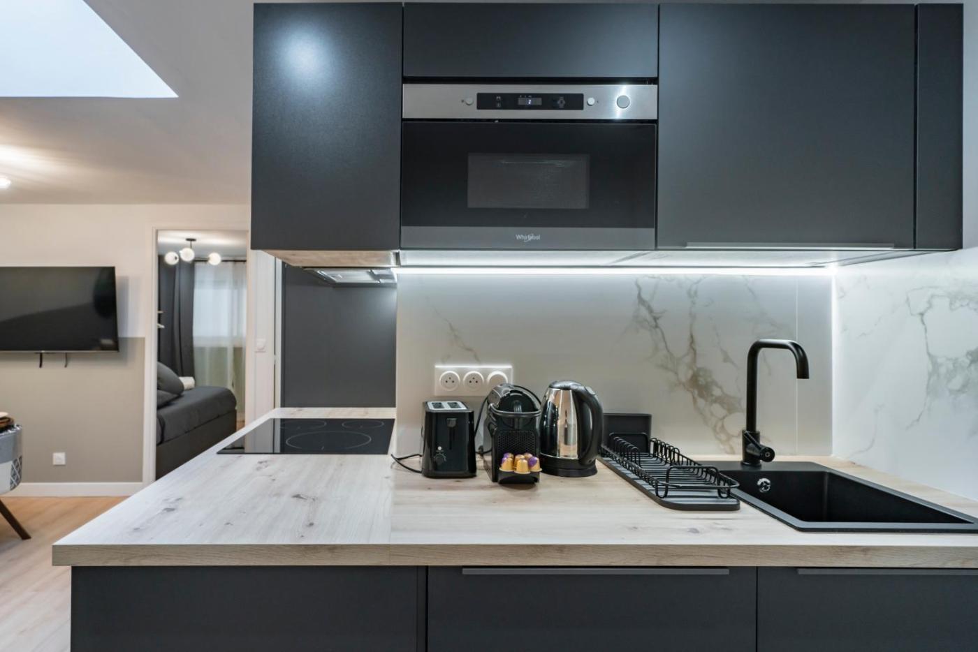 Two-Bedroom Apartment. Boasting a private entrance, this air-conditioned apartment features 1 living room, 2 separate bedrooms and 1 bathroom with a shower and a hairdryer. In the well-fitted kitchen, guests will find a stovetop, a refrigerator, a dishwasher and kitchenware. The apartment has parquet floors, a seating area with a flat-screen TV with streaming services, a washing machine, soundproof walls, as well as a tea and coffee maker. The unit has 3 beds.