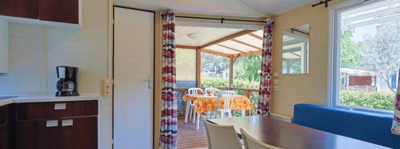 Mobile Home 3. This mobile home includes 2 bedrooms, kitchen, a terrace and 1 bathroom with a shower. The well-fitted kitchen has a refrigerator, kitchenware and a microwave. The mobile home offers air conditioning and a private entrance. The unit has 3 beds. ;